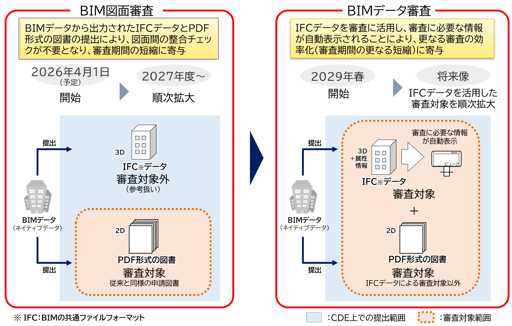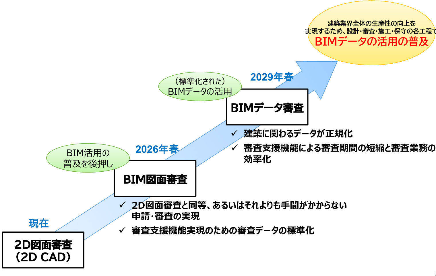 まずBIMに対応可能な指定確認検査機関から段階的に導入が始まります。 さらに2029年春からはBIMデータそのものを審査対象とする「BIMデータ審査」へと発展していく計画がされています。