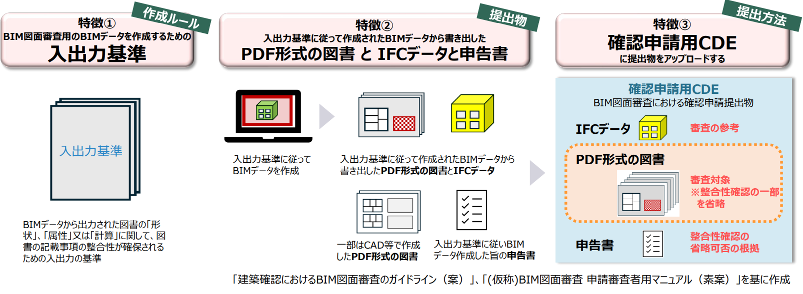 入出力基準に従い作成されたBIMデータから書き出された図書を活用することにより、図書の整合性確認を一部省略するほか、審査の参考としてIFCデータを活用することにより、建築確認のための申請・審査を効率的に行うことができる
